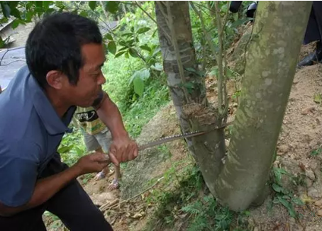 用半斷桿法促使沉香樹快速結香的方法,是在離沉香樹干基部1米以上的樹干上鋸一個傷口,傷口的深度約為沉香樹干直徑的1/3至1/2。沿著沉香樹干同一個方向的不同高度,按照以上方法再多鋸幾個傷口,傷口與傷口之間的間距約為30-40厘米左右,傷口寬度約為1厘米左右。